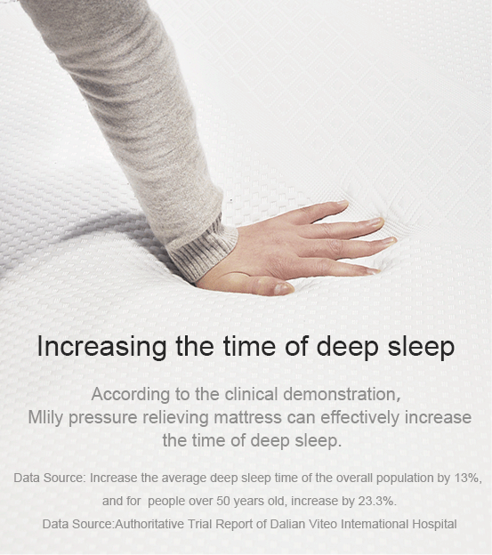 By reliving pressure, Mlily mattresses improves sleep quality by prolonging the deep sleep cycle by up to 23.3%. Data source: Authoritative Trial Report of Dalian Viteo International Hospita